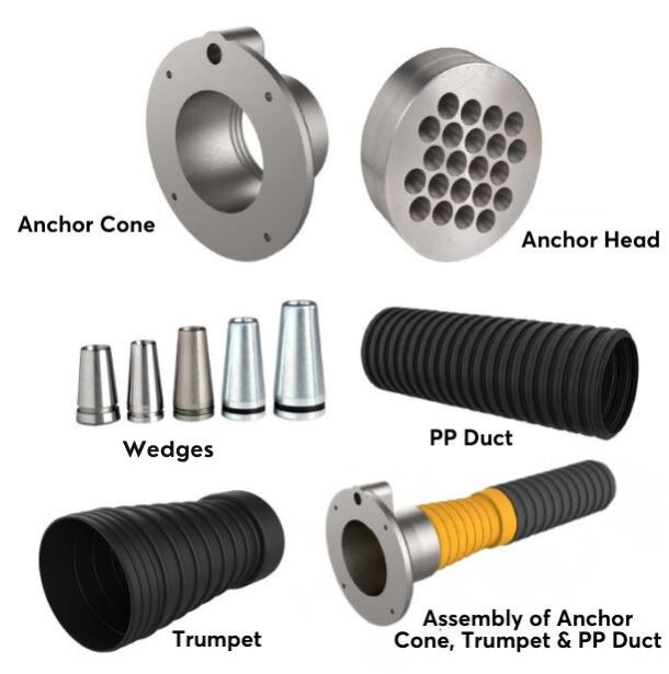 Anchorage, as the name suggests, is a vital component of the post-tensioning system. Anchorage components plays a crucial role in securing the tendons to the concrete, either by terminating or connecting two tendons. The primary function of the anchorage is to effectively transfer the stressing force to the concrete once the stressing process is completed, ensuring the stability and strength of the structure.