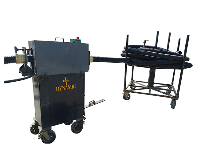 For internal tendons, HDPE/PP ducts are placed within the rebar cage before concreting. For longer-span tendons, coils of duct are mounted on a dispenser. The Dynamic Duct Pusher Machine or a winch arrangement efficiently pushes the duct into the rebar cage, ensuring precise placement and smooth operation.